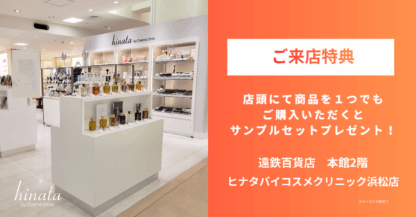 この広告を見た方限定! 遠鉄百貨店本館2階ヒナタパイコスメクリニックにて商品を1つでも ご購入いただくと化粧品サンプルセットをプレゼント。 数量限定 なくなり次第終了!